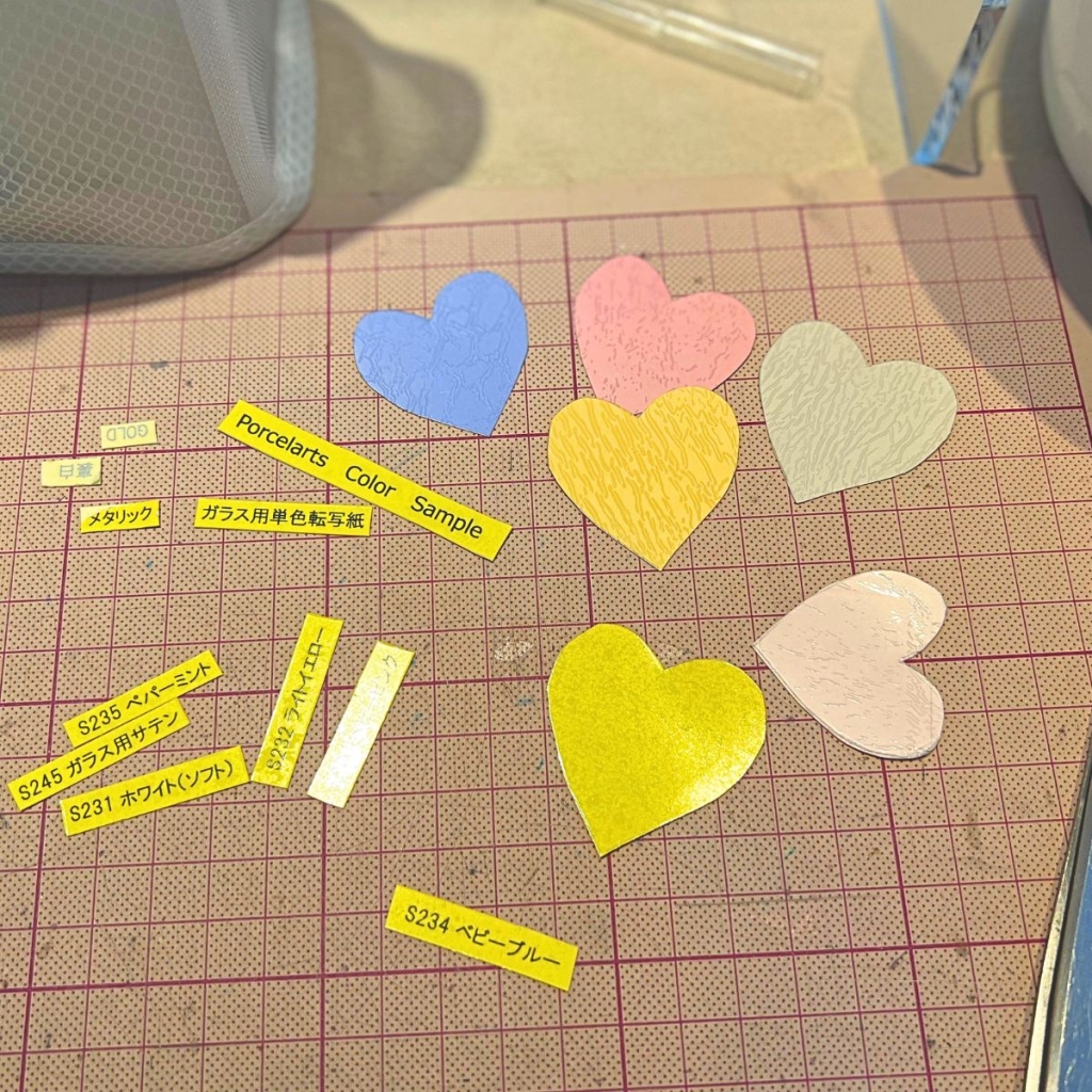 課題1で、白磁用転写紙の色見本を作りました(現在も進行中)。