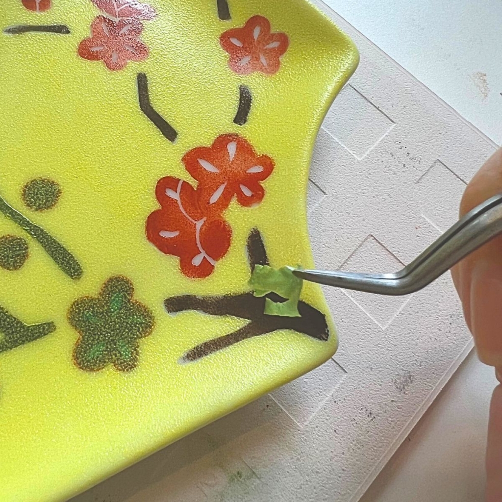 イラストの着色がすんだ状態で、一度焼成します。
